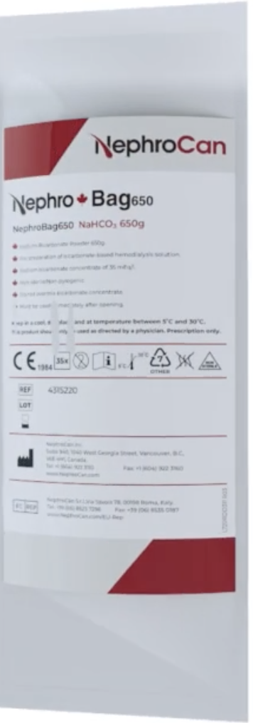 NephroBag - это препарат высококачественного порошка бикарбоната натрия для проведения одной процедуры гемодиализа. При добавлении очищенной воды и концентрированной кислоты порошок мгновенно растворяется, образуя раствор, который затем может быть использован для получения предписанной дозы для одной процедуры гемодиализа (до пяти часов при скорости потока диализата 500 мл в минуту).