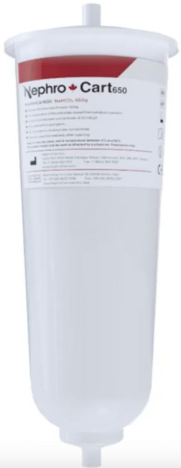 NephroCart - это полипропиленовый картридж с порошком бикарбоната натрия для поточного приготовления диализатного раствора. При подключении к гемодиализному аппарату очищенная вода проходит через порошок, в результате чего образуется буферная жидкость на основе бикарбоната натрия, используемая для очистки крови в процессе гемодиализа.